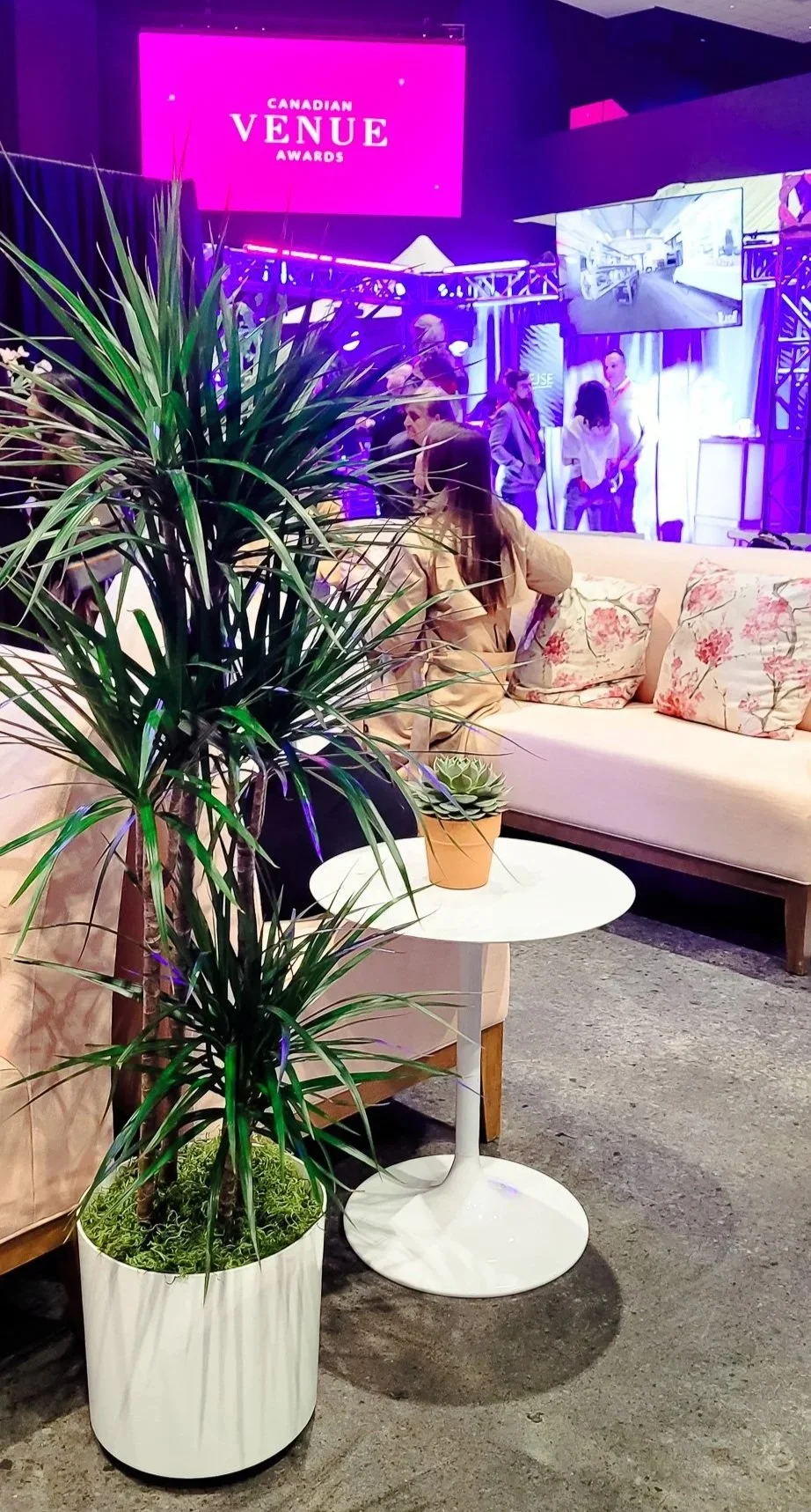 The same principle applies to corporate events. In spaces that might otherwise feel sterile or overly formal, thoughtfully placed plants can soften the environment and create a more welcoming atmosphere. A collection of sculptural plants near an entrance, a living wall behind a stage, or clusters of potted greenery throughout a lounge area can instantly make a space feel more dynamic and engaging for guests!